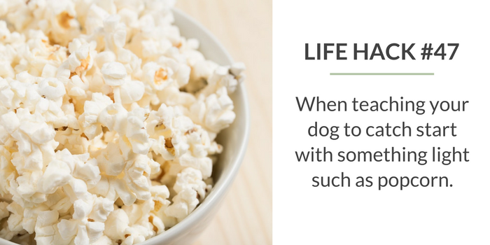 If your dog doesn’t know how to catch don’t start by throwing a toy at their face. Popcorn works great for training dogs to catch because it’s light & yummy which makes it enticing enough for your dog to try and catch it.