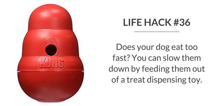If your dog eats too fast use a food dispensing toy (we love the Kong Wobbler & Bob a Lot), or place a few tennis balls in their bowl to slow their eating. Not only does this keep them from eating too quick, it gives them a nice mental workout.
